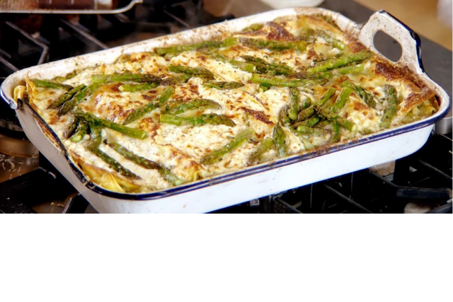 Pour over lasagne; press asparagus in and scatter over parmesan.