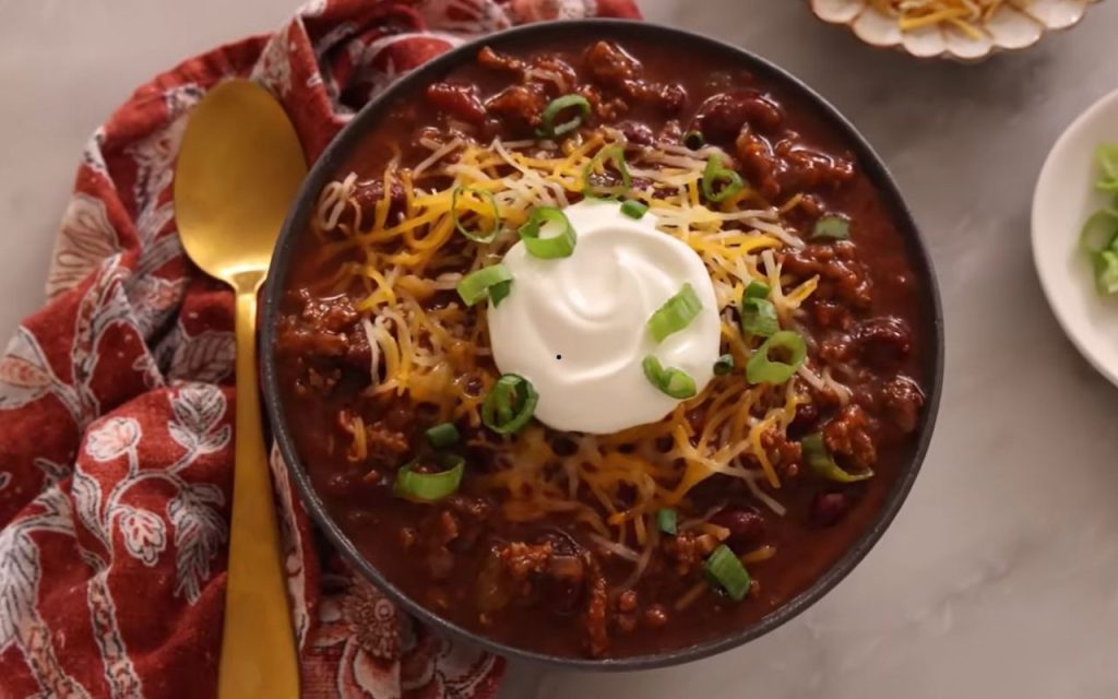6. Serve Once cooked, ladle the chili into bowls. Top with your choice of garnishes, such as shredded cheese, scallions, or a dollop of sour cream.