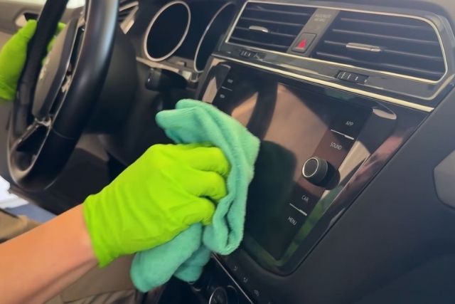 After clearing out the car, the expert dusts the dashboard and trim with a microfiber cloth. Then, he applies a protectant to these surfaces to keep them looking new and shield them from harmful UV rays.