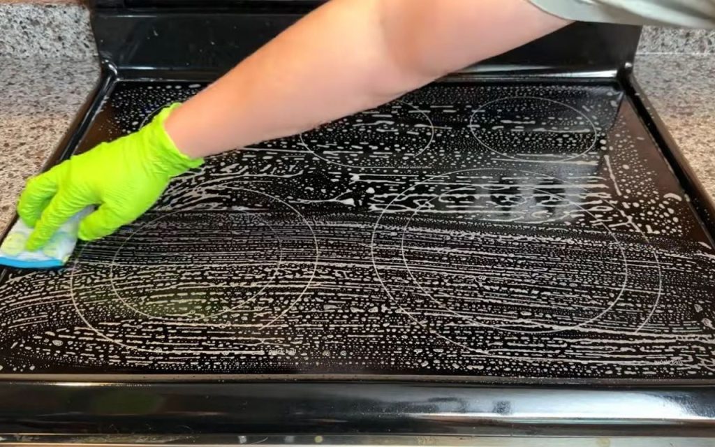 - Scrub Again: Scrub the entire cooktop again using circular motions, focusing on the burner areas.