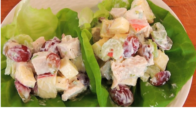 Add the turkey, apple, grapes, and walnuts. Toss to coat. - Line 4 small plates with 3 lettuce leaves each.